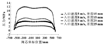 對閥內(nèi)流場進(jìn)行數(shù)值模擬,可以給出閥芯在不同位置時,沿閥芯表面的壓力分布,以此可研究調(diào)節(jié)閥在不同位置時受到的不平衡力。圖4為不同開度、不同流量時閥芯底部壓力分布??梢钥闯觯洪y通過相同流量時,開口度越大,不平衡力越??;開口度不變時,隨著流量的增加閥芯底部壓力急劇增加,小開口度時尤甚,由于節(jié)流口的作用,靠近節(jié)流口部位的壓力變化最明顯,閥中心位置壓力變化稍緩。