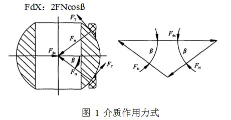 由于閥座和殼體不是粘接密封而是壓縮密封,因此出口端閥座軸向總密封力FMZ應(yīng)由閥座軸向動密封力FdX和靜密封力FJX合成。文獻[ 1 ]推薦FMZ :FNC0,其值得推敲,F(xiàn)N是FMZ分力,應(yīng)小于FMZ,其次未納人靜密封力,不適合壓縮密封的靜密封結(jié)構(gòu)。由此計算的啟閉力矩也與測量值不符。忽略空心球重力影響,F(xiàn)dX在動密封面上分解為法向力FN和摩擦力FT。其中FT為較小量,省略不計,則FdX分解為一對法向力(圖1),顯然