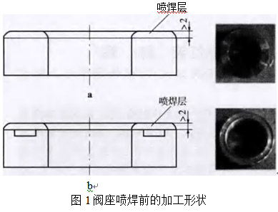 為了避免等離子弧高加熱速度和溫度產(chǎn)生的涂層剝落破壞的開裂、飛濺、滴流及其他不良影響,在任何加工形式時(shí)應(yīng)仔細(xì)選擇噴涂規(guī)范。等離子弧噴焊時(shí)的工藝參數(shù)如表1所示。等離子噴涂噴槍的功率40 kw,送粉方式為槍外送粉。另外,噴嘴到工件距離為1儺巧mm,工作臺轉(zhuǎn)速10、巧r/min等離子弧噴焊時(shí)和噴焊后的閥座外觀如圖2所示。