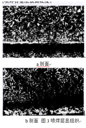 用OLYMPUS-PME3金相顯微鏡(0M)和JSM弘5C 掃描電鏡(SEM)對噴焊合金層進(jìn)行顯微組織觀察和分析,如圖3所示。用HR-150AT型光學(xué)洛氏硬度計(jì)測量噴焊合金層表面硬度