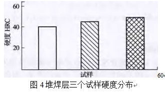 三個(gè)試樣硬度分析結(jié)果如圖4所示。由于鎳基堆焊合金層存在較高的cr,會形成更多化合物相,且其組織細(xì)小均勻,硬度較高,滿足耐磨性的要求。
