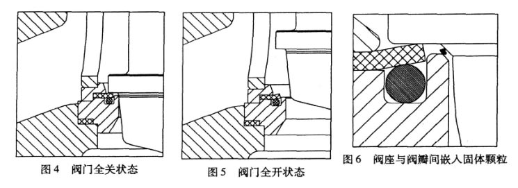 對于夾帶固體顆粒的流體介質 ,軟閥座閥門的密封結構更為重要。這主要是因為介質中夾帶有固體顆粒時 ,極容易卡在閥瓣和閥座的密封面之間 ,妨礙了閥座的密封 ,會引起泄漏 ,繼而由于介質的高速沖刷而使閥座表面被沖蝕破壞。對于上述具有二級關閉作用的軟閥座密封結構 (圖 6) ,即使出現(xiàn)了這種顆粒卡在閥瓣和閥座金屬密封部位之間 ,也不會有什么危害 ,因為還有閥瓣和軟閥座之間的密封 ,仍能起到可靠有效的補充密封作用。