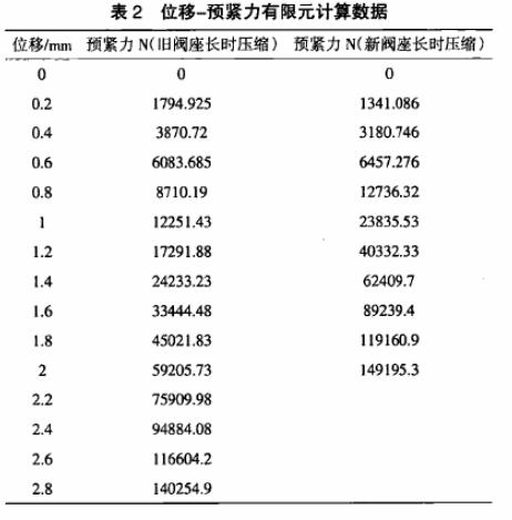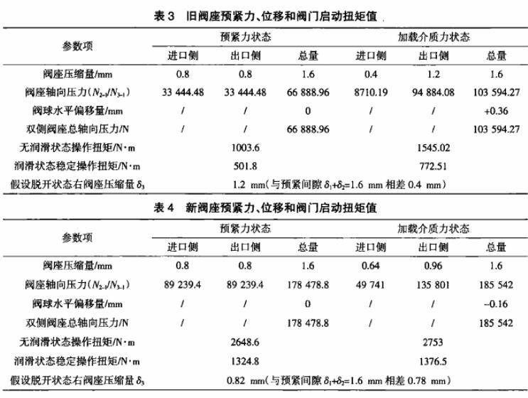 系統(tǒng)加載后球體與左閥座是否脫開圖3閥座幾何尺寸根據(jù)計算參數(shù)和圖表,舊閥座的63為1.2 mm,新閥座的為0•82 mmo由4」的公表2位移一預(yù)緊力有限元計算數(shù)據(jù)位移/ ] 預(yù)緊力 NC舊閥座長時壓縮) 預(yù)緊力N(新閥座長時壓縮 )式判斷出,在安裝新或舊閥座時,系統(tǒng)加載后閥門的球體均未與左閥座脫開。