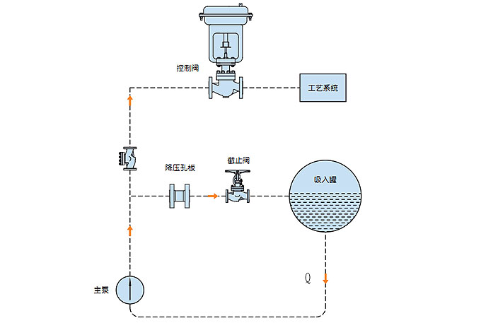 連續(xù)循環(huán)系統(tǒng)泵的最小需求流量與系統(tǒng)的工藝流量變化無(wú)關(guān)。最小流量設(shè)定好后經(jīng)過(guò)減壓孔板直接回流至儲(chǔ)罐,連續(xù)的最小流量循環(huán)雖然可以很好的保護(hù)泵,但是必須泵提供更大輸出功率以保證系統(tǒng)工藝流量加上再循環(huán)流量,造成額外的能源浪費(fèi)。